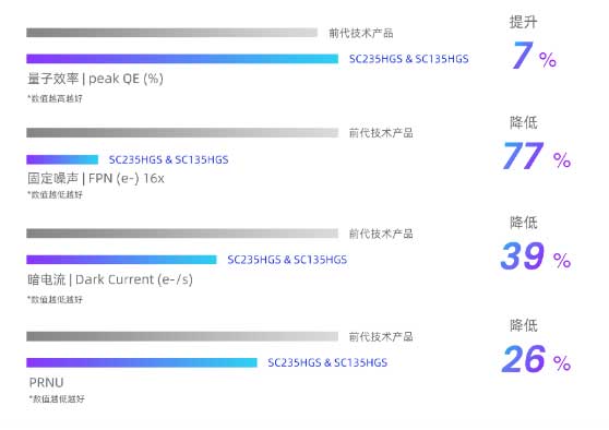 借助思特威創(chuàng)新的超低噪聲外圍讀取電路技術(shù),SC235HGS和SC135HGS實現(xiàn)了更佳的噪聲抑制,并進一步優(yōu)化了產(chǎn)品在高溫下的成像性能。在16倍增益下SC235HGS和SC135HGS的固定噪聲(FPN)低至2.03e-,與前代技術(shù)產(chǎn)品相比,大幅降低了約77%。此外,兩顆芯片均實現(xiàn)了低至0.62%的PRNU,暗電流(DC)在80°C環(huán)境下更是低至350e-/s,與前代技術(shù)產(chǎn)品相比,分別降低了26%及39%以上,不僅帶來干凈明細、低噪聲的成像效果,同時也改善了新品在高溫下的成像性能。
