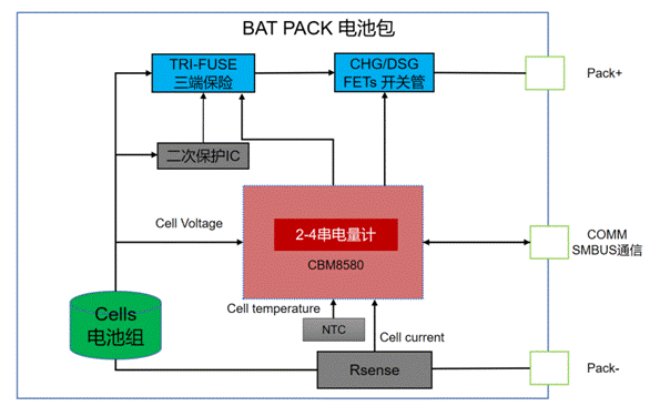 其中,CBM8580是一款基于2-4節(jié)串聯(lián)鋰離子或鋰聚合物電池組的單芯片全集成方案。該產(chǎn)品可為 2 節(jié)、3 節(jié)和 4 節(jié)串聯(lián)鋰電池組提供電量監(jiān)測、保護(hù)和認(rèn)證等功能,利用其集成的高性能模擬外設(shè),測量鋰電池的可用容量、電壓、電流、溫度和其他關(guān)鍵參數(shù),保留準(zhǔn)確的數(shù)據(jù)記錄,并通過通訊接口將這些信息報告給系統(tǒng)主機(jī)控制器。