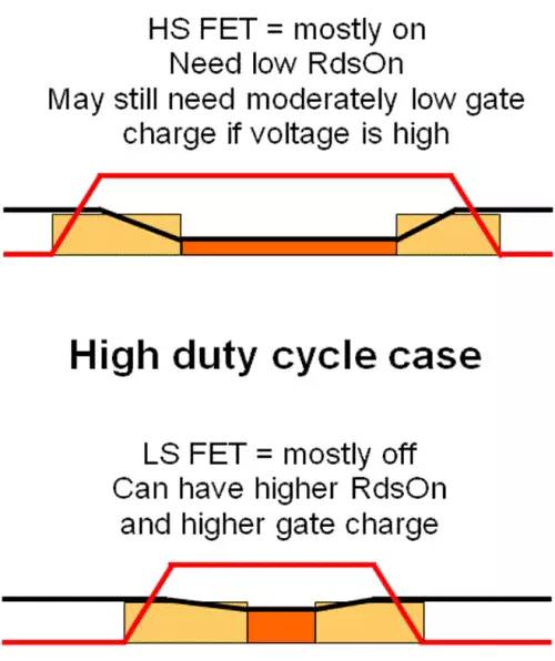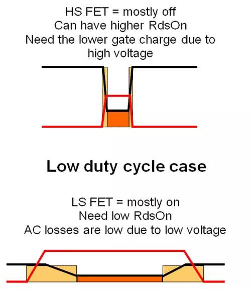 低占空比設(shè)計意味著高輸入電壓,對這些設(shè)計而言,高側(cè) FET 大多時候均為關(guān)斷,因此 DC 損耗較低。但是,高 FET 電壓帶來高 AC 損耗,所以可以選擇低柵極電荷的 FET,即使導(dǎo)通電阻較高。低側(cè) FET 大多數(shù)時候均為導(dǎo)通狀態(tài),但是 AC 損耗卻。這是因為,導(dǎo)通/關(guān)斷期間低側(cè) FET 的電壓因 FET 體二極管而非常地低。因此,需要選擇一個低導(dǎo)通電阻的 FET,并且柵極電荷可以很高。圖 7 顯示了上述情況。