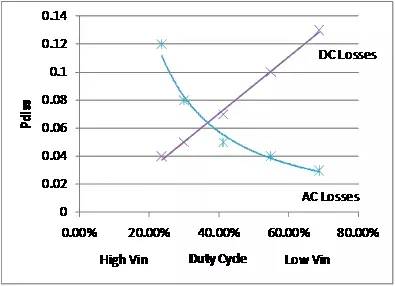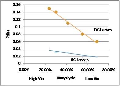 圖 9 中,高側(cè) FET 反應(yīng)曲線圖表明,占空比從 25% 增至 40% 時 AC 損耗明顯降低,而DC 損耗卻線性增加。因此,35% 左右的占空比,應(yīng)為選擇電容和導(dǎo)通電阻平衡FET的理想值。不斷降低輸入電壓并提高占空比,可以得到的AC 損耗和的 DC 損耗,就此而言,我們可以使用一個低導(dǎo)通電阻的 FET,并折中選擇高柵極電荷。如低側(cè) FET 圖 10 所示,控制器占空比由低升高時 DC 損耗線性降低(低側(cè) FET 導(dǎo)通時間更短),高控制器占空比時損耗。整個電路板的AC 損耗都很低,因此任何情況下都應(yīng)選擇使用低導(dǎo)通電阻的 FET。