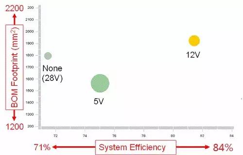圖 13 電源設(shè)計曲線圖,其表明中間軌電壓對電源系統(tǒng)效率、體積和成本的影響。圓直徑為 BOM(材料清單)價格。