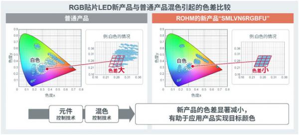 近年來,隨著汽車電子化程度的提高和功能多樣化的發(fā)展,車速自動控制、車距檢測、車道線檢測等各種駕駛輔助功能得以廣泛應用。為了用儀表盤等的指示燈顯示這些功能的工作狀態(tài),業(yè)內(nèi)對于能夠表現(xiàn)各種顏色的RGB貼片LED的需求日益高漲。另外,對使用RGB貼片LED來打造車內(nèi)空間的舒適感和奢華感的內(nèi)飾產(chǎn)品的需求也在不斷增加。在這種背景下,ROHM利用自有的元件技術,通過精細地控制RGB元件的發(fā)光特性并提高混色性能,開發(fā)出色差更小的RGB貼片LED。