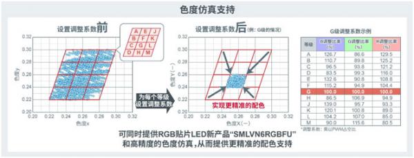 SMLVN6RGBFU為每個色度等級設置了調(diào)整系數(shù),并提供更接近目標顏色的配色支持。通過同時提供RGB貼片LED新產(chǎn)品和高精度的色度仿真,可以實現(xiàn)更精細的配色效果。