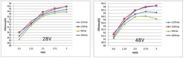 該方案在230Vac和5V輸出沒接負(fù)載的情況下,輸入功率小于100mW, 待機(jī)功耗及48V下PF曲線如下圖。在5V小負(fù)載下的效率及各個輸出下0.25W的效率也很好。在115 VAC(藍(lán)色曲線)和230 VAC (紅色曲線)輸入電壓的平均能效和輕載(10%負(fù)載)能效,從下面曲線圖可看到都遠(yuǎn)高于COC V5 Tier 2平均能效標(biāo)準(zhǔn)和COC V5 Tier 2輕載能效標(biāo)準(zhǔn),由于PFC在5V,9V,12V時(shí)停止工作,所以可以看到這幾個電壓下效率較高,28V和48V滿載下的效率也非常高。