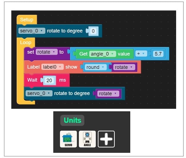 將電位器連接到 M5Stack 內(nèi)核后,需要軟件來顯示電氣元件的旋轉(zhuǎn)值。UiFlow 軟件將用于顯示電位器的旋轉(zhuǎn)角度(以度為單位),代碼塊包含伺服電機(jī)控制器的三個主要操作。