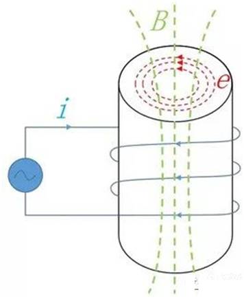 對一根流過電流為I的導線,在導線的垂直平面形成交變磁場,交變磁場在導體內部產生感應電動勢,感應電動勢在導體內部形成渦流電流,渦流在導體內部與電流的變化趨勢相反,阻礙電流的變化,渦流的變化在導體表面與電流的變化趨勢相同。