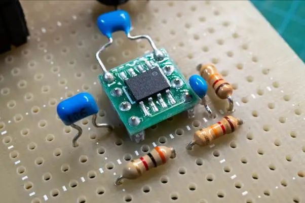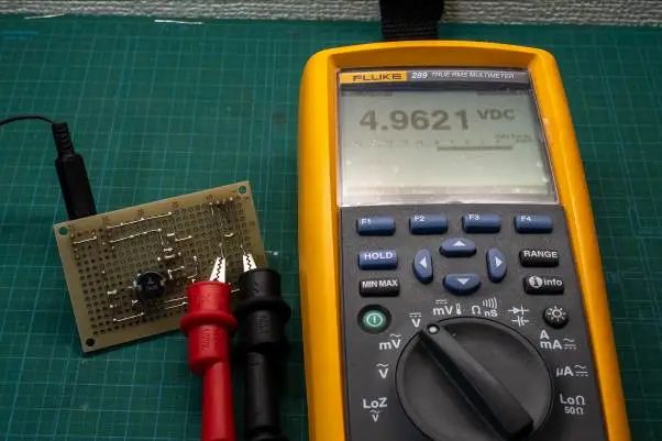 將開(kāi)關(guān)穩(wěn)壓器IC裝在轉(zhuǎn)換板上之后安裝在萬(wàn)用板上的樣子。