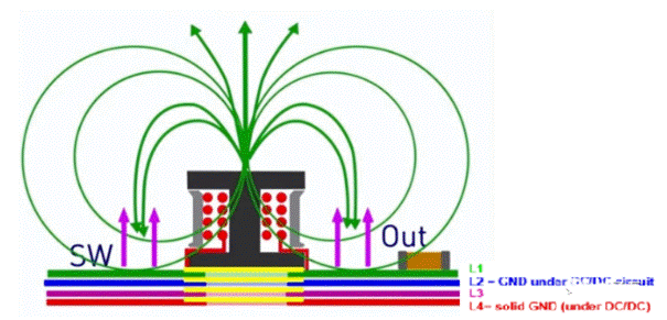 當(dāng)Boost升壓正常工作時(shí),電感中流過(guò)負(fù)載電流,形成回路。由于開關(guān)管的存在,電流是動(dòng)態(tài)變化的,由此可形成電感的磁感線,在導(dǎo)體的表面部分磁感線回形成封閉的磁回路,部分磁路會(huì)形成漏磁溢出到空氣中。如果電感底部沒有敷銅時(shí),從電感中溢出的磁感線會(huì)在整個(gè)電源系統(tǒng)中存在,使系統(tǒng)沒有相對(duì)安靜的空間,會(huì)造成EMI的性能下降。
