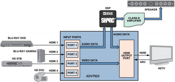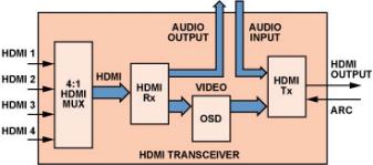 以 ADV7623 為例,這款 HDMI 收發(fā)器集成了 4:1  HDMI 輸入多路復(fù)用器 (mux )、 HDMI 接收器、 屏幕顯示 (OSD)引擎和 HDMI 發(fā)射器。就個(gè)體而言, 上述每種功能應(yīng)該都需要彼此 獨(dú)立的 IC 及五花八門的固件,但一個(gè)收發(fā)器就可以將全部功能組合到一個(gè)綜合解決方案中, 節(jié)省了板載面積、降低了固件 復(fù)雜程度、縮減了物料成本, 為家庭影院系統(tǒng)設(shè)計(jì)人員帶來了 極大方便。