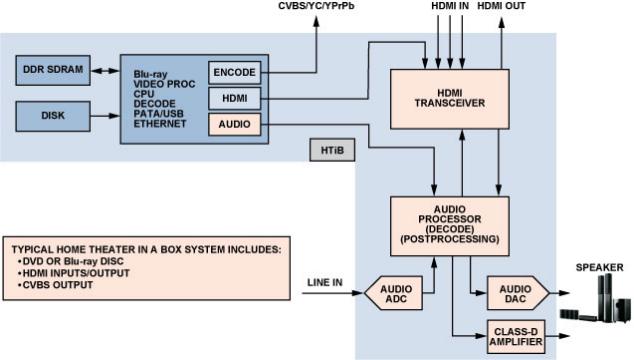 HTiB  屬于完整的視頻播放系統(tǒng),一般采用多通道音頻放大器 和環(huán)繞聲音響系統(tǒng)來播放音頻。此外, 該系統(tǒng)通常還包括一個(gè) DVD 或 Blu-ray™視頻播放機(jī)。HTiB 簡化了視頻播放機(jī)、放大 器和揚(yáng)聲器的安裝和功率匹配, 它主要處理音頻, 視頻則通過 HDMI 接口傳送給電視機(jī)。圖 2 所示為一個(gè)典型的 HTiB 系統(tǒng)。