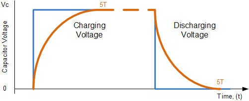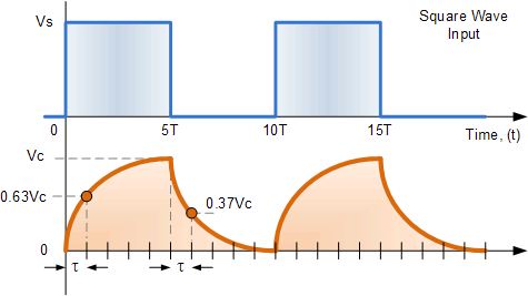 根據(jù)輸入電壓,電容器兩端的電壓降在充電至Vc和放電至零之間交替。在此示例中,輸入方波電壓波形的頻率(以及由此產(chǎn)生的時間周期f = 1/T )與5RC時間常數(shù)的兩倍完全匹配。