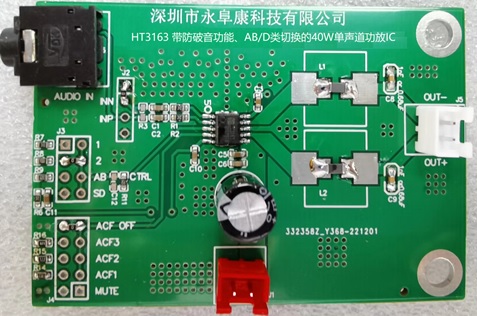 2,采用帶AB/D類切換功能的單聲道40W功放芯片HT3163(立體聲應(yīng)用采用2顆),能夠完全避免FA/AM收音干擾。兩節(jié)鋰電供電升壓到16V輸出2*30W;3節(jié)鋰電或鉛酸電池升壓18V輸出2*40W;