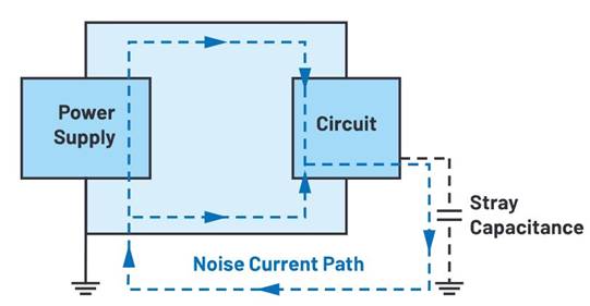 CM噪聲電流是在開關過程中產生的,通過雜散電容泄漏到參考地,然后通過同一方向的輸入電源和回路返回。通過使用CM扼流圈提高回路中的共模阻抗,可以抑制多余的CM噪聲。