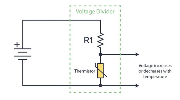 分壓電路的一個典型案例是用于模擬傳感器。例如,熱敏電阻是溫度傳感器。它會根據(jù)溫度改變其電阻。如果將其與分壓電路中的已知電阻值連接,我們就能獲得取決于溫度的電壓: