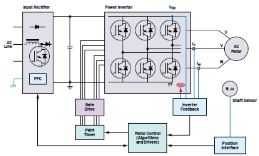 在過去的幾十年里,從傳統(tǒng)的并網(wǎng)電機向逆變器驅(qū)動電機的過渡一直在穩(wěn)步、持續(xù)地進行。這是工業(yè)旋轉(zhuǎn)設(shè)備的重大轉(zhuǎn)型,通過提高電機和終端設(shè)備的使用效率,不僅實現(xiàn)了工藝改進,還能節(jié)省大量能源。變速驅(qū)動器和伺服驅(qū)動系統(tǒng)提高了電機控制性能,從而可以改善要求嚴苛應用的質(zhì)量和同步功能。如圖1所示,功率級使用了功率逆變器、高性能位置檢測以及電流/電壓閉環(huán)反饋,因此電機性能和效率得以提高。