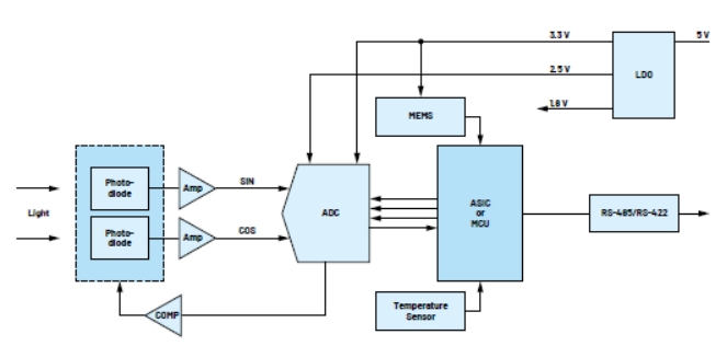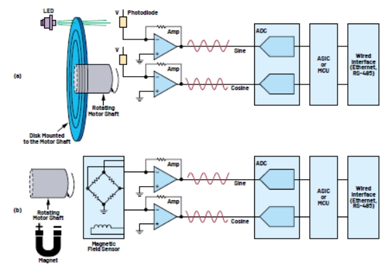 編碼器通過跟蹤旋轉(zhuǎn)軸的速度和位置來提供閉環(huán)反饋信號。光學和磁編碼器技術(shù)使用非常廣泛,如圖2所示。在通用伺服驅(qū)動器中,編碼器用于測量軸位置,從中可推導出驅(qū)動器轉(zhuǎn)速。機器人和離散控制系統(tǒng)需要準確且可重復的軸位置。光學編碼器由帶有精細光刻槽的玻璃圓盤組成。當光穿過圓盤或從圓盤反射時,光電二極管傳感器檢測光的變化。光電二極管的模擬輸出經(jīng)過放大和數(shù)字化處理后,通過有線電纜發(fā)送到逆變器控制器。磁編碼器由安裝在電機軸上的磁體和磁場傳感器組成,傳感器提供正弦和余弦模擬輸出,輸出經(jīng)過放大和數(shù)字化處理。光學和磁傳感器信號鏈類似,如圖2所示。