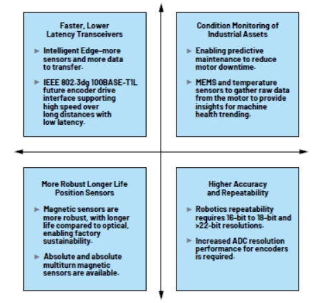 Rockwell1關(guān)于伺服驅(qū)動器、編碼器和編碼器通信端口的研究表明,用于反饋通信的收發(fā)器每年增長20%。支持通過兩條線(IEEE 802.3dg標準100BASE-T1L)1進行100 Mbps通信的單對以太網(wǎng)(SPE)收發(fā)器目前正在研究中,未來的編碼器驅(qū)動接口將受益于低延遲,目標性能為≤1.5 µs。這種低延遲將支持更快的反饋數(shù)據(jù)采集和更短的控制環(huán)路響應時間。