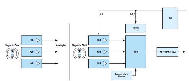 AMR傳感器對磁場方向變化很敏感,而霍爾技術(shù)對磁場強度很敏感。所以傳感器對系統(tǒng)中的氣隙和機械公差變化具有很強的容忍度,這一點很有優(yōu)勢。此外,AMR傳感器的工作磁場沒有上限,因此,這種傳感器在高磁場下工作時幾乎不受雜散磁場的影響。
