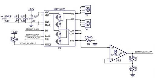 由于我決定添加一個用于自動電流調(diào)節(jié)的檢測電阻器,因此我還可以添加一些額外的組件,使 EFM8 微控制器能夠收集有關(guān)電機(jī)在各種工作條件下需要多少電流的信息。這就是運算放大器電路的用途,它只是一個增益為 10 的同相放大器,用作 R SENSE兩端的電壓與 EFM8 的 ADC 電路之間的接口電路。 |