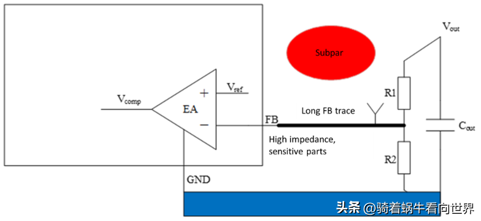 圖 8:長 FB 走線更易耦合非實反饋