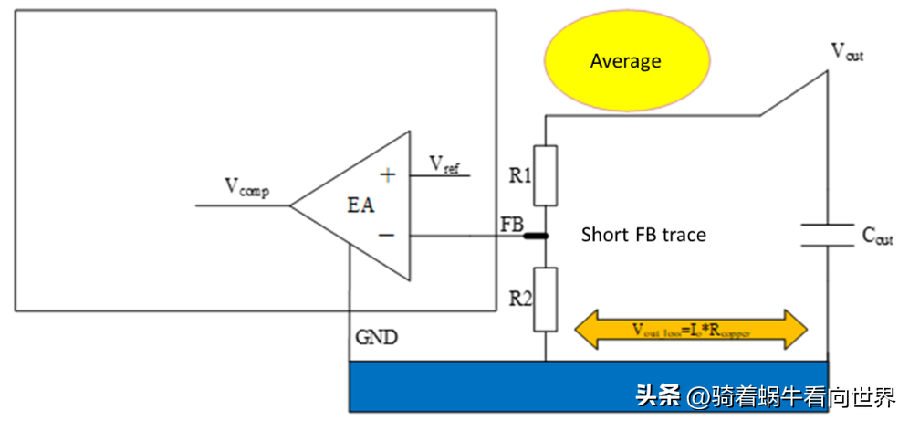 確定 FB 分壓電阻值后,還需要注意 FB 引腳的接線。FB 是容易耦合噪聲的高阻抗引腳。在實際應(yīng)用中,常見到 R1、R2 放在輸出電容端,這導(dǎo)致 FB 走線較長。這段 FB 走線充當(dāng)了天線,更易耦合非實反饋,繼而導(dǎo)致 VOUT 變化或不穩(wěn)(見圖 8)。