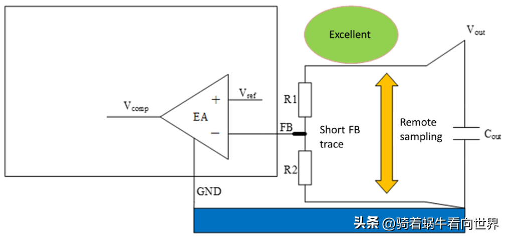 一般在輸出電流(IOUT)只有幾個安培時,R2 的接地可以靠近芯片地。但當(dāng) IOUT 超過 10A 時,由于接地線上的敷銅有限,地線上的電壓會損失,導(dǎo)致實際 VOUT 低于預(yù)設(shè)電壓。在這種情況下,建議使用遠程采樣(見圖 10)。