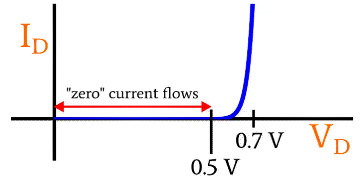 正如您所看到的,當(dāng)正向電壓低于 0.5 V 時(shí),幾乎沒(méi)有正向電流流動(dòng)。在該區(qū)域中,電流相對(duì)于電壓的增加緩慢增加。