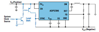 反相降壓-升壓電路產(chǎn)生的負電壓幅度可以高于或低于可用正電壓的幅度。例如,從+12 V可以生成-8 V,甚至-14 V。當使用具有反相降壓-升壓電路的開關穩(wěn)壓器IC時,系統(tǒng)可能需要設計通信引腳。如果確實需要,設計人員必須進行充分的電平轉(zhuǎn)換,以便可以利用同步和使能信號。