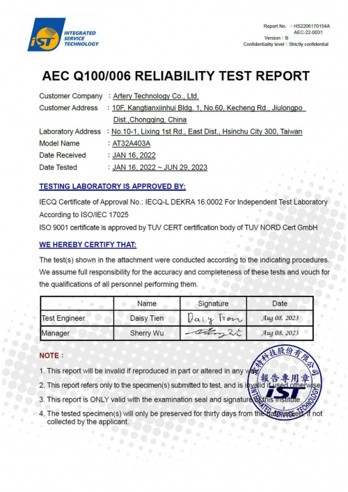 Council)制定的車用電子元件可靠性測試標準,在全球汽車產(chǎn)業(yè)都具有極高的權(quán)威性。AEC-Q100認證門檻高,測試項目覆蓋廣,對芯片產(chǎn)品的設(shè)計質(zhì)量、安全性、可靠性要求極為嚴苛,是集成電路廠家進入汽車領(lǐng)域的重要通行證。AT32A403A通過AEC-Q100認證,標志著雅特力車規(guī)級MCU性能與可靠性等指標符合國際車規(guī)芯片標準,產(chǎn)品質(zhì)量獲得國際權(quán)威認證體系的認可和肯定。
