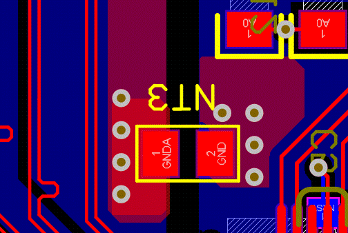 分離地平面:將地線分為模擬地和數(shù)字地兩個(gè)區(qū)域,并使用兩個(gè)獨(dú)立的地平面來布線。這樣可以防止模擬信號(hào)和數(shù)字信號(hào)間的互相干擾,其中,模擬地與數(shù)字地的距離不下于1mm,由于結(jié)構(gòu)限制畫不了這么寬的則可適當(dāng)?shù)臏p小。