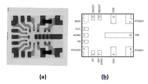 集成輸入電容器下一代 EMI 優(yōu)化封裝使用集成電容器來(lái)進(jìn)一步降低輸入寄生電感。LMQ61460-Q1 在兩側(cè)均包含兩個(gè)集成輸入旁路電容器,每個(gè) VIN/PGND 對(duì)各一個(gè)。這些電容器是橫跨右上和右下引腳對(duì)(VIN 和 PGND)的黑色矩形,如圖 2a所示。圖 2b 顯示了器件引腳排列以供參考。