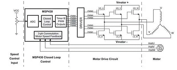 圖 2:三相 BLDC 電機(jī)的典型閉環(huán)控制系統(tǒng)包括控制器、驅(qū)動(dòng)器和功率晶體管半橋 H。(圖片:德州儀器)