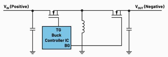 反相降壓-升壓拓撲是基本開關穩(wěn)壓器拓撲之一,只需要一個電感、兩個電容和兩個MOSFET開關。其中的開關可由任意降壓穩(wěn)壓器或控制器驅動。因此,可供使用的開關穩(wěn)壓器構建模塊有很多。圖1顯示了具備所有必要元件的反相拓撲。