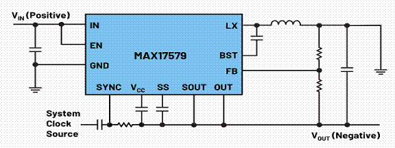 圖3.MAX17579設計為反相降壓-升壓穩(wěn)壓器,其中已集成電平轉換功能