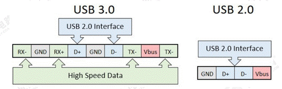 圖1 USB 2.0與USB 3.0管腳定義