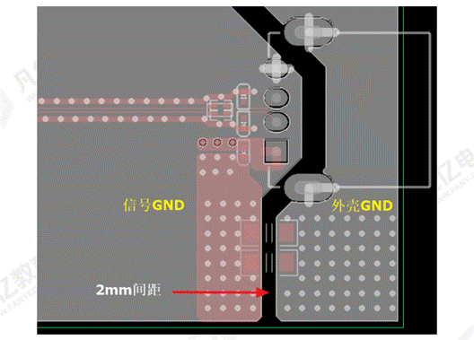 4、若USB兩邊定位柱接的是保護(hù)地,分割時(shí)保證與GND的距離是2MM,并在保護(hù)地區(qū)域多打孔,保證充分連接,如圖2所示。