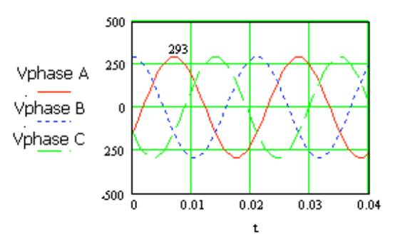 圖 2 208VAC/60Hz 系統(tǒng)的各相電壓與時(shí)間的關(guān)系