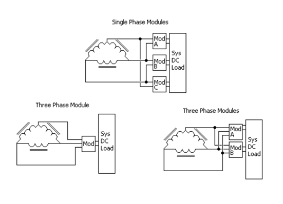 單相模塊具有更簡單、更高效的電源轉(zhuǎn)換電路的優(yōu)點(diǎn),但為了完全平衡線路電流,電源轉(zhuǎn)換器必須以三的倍數(shù)來實(shí)現(xiàn)。在各個(gè)電源模塊尺寸和整體系統(tǒng)負(fù)載之間找到合適的配合有時(shí)可能具有挑戰(zhàn)性。如果模塊為公共負(fù)載供電,則必須在模塊之間采用功率共享電路,以確保從每相汲取的功率相等。功率共享電路可以采用“下垂”共享電路的形式,其中小的非耗散合成阻抗與每個(gè)模塊的輸出串聯(lián)添加。這將迫使模塊共享電流,就好像一個(gè)單元的電流大于其他單元一樣,其輸出電壓將下降,直到其負(fù)載電流與系統(tǒng)中的其他單元匹配;蛘,單線,