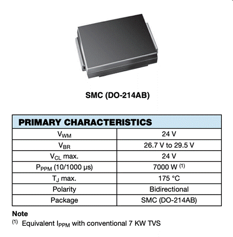 在每一個電池組、每一個電池簇與外部的連接電路中,都會有二極管的存在,通過其單向?qū)ǖ哪芰泶_保通信接口不受到損壞;同時在多種電路拓撲中,也都需要二極管的參與。在此我們?yōu)榇蠹彝扑]一款來自Vishay的二極管器件,非常適用于儲能系統(tǒng)BMS的應用。該器件名為XMC7K24CA XClampR™ TVS二極管,在貿(mào)澤電子的具體料號為“XMC7K24CA-M3/H”。