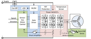 圖 1 顯示了典型的無傳感器 BLDC 電機系統(tǒng)。以藍色突出顯示的元件通常是柵極驅(qū)動器集成電路 (IC) 的一部分,其中功率 MOSFET 位于電路板上 IC 的外部。當柵極驅(qū)動器 IC 也包括以紅色突出顯示的元件時,IC 稱為電機驅(qū)動器或集成式 FET 驅(qū)動器。以綠色突出顯示的元件是電機控制器的一部分。我們將重點討論柵極驅(qū)動器和電機驅(qū)動器架構(gòu)。