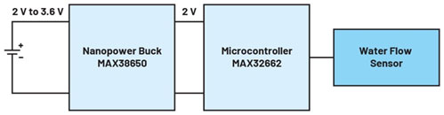 采用電池供電的電路必須具備高能效,這樣電池才能長時間持續(xù)供電。為此,應當選擇節(jié)能型元器件并將其整合到系統(tǒng)中。電路中的構建模塊越少,整個系統(tǒng)的能效就越高。圖1所示的電水表就是一種電池供電設備。該系統(tǒng)采用MAX32662微控制器,僅有一個電源電壓。輸入電壓介于1.71 V和3.63 V之間。