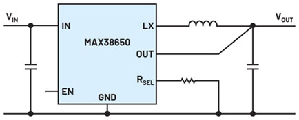 如圖3所示,電路僅需要少量無源外部元件。僅使用RSEL引腳上的一個電阻來設置輸出電壓,并未使用電阻分壓器。電阻分壓器會消耗相當多的電流,根據電壓和電阻的不同,此電流可能大大超過MAX38650的靜態(tài)電流。因此,該IC使用可變電阻,僅在電路接通時短暫檢查此電阻。該IC通過以下方式檢測設定點輸出電壓值:在接通期間的短時間內,使200 µA的電流流過該可變電阻。然后測量所產生的電壓,并將其存儲在IC內部。這意味著,在通過常規(guī)分壓器運行期間不會有能量損失。