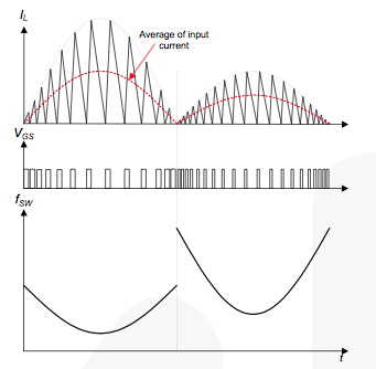BCM PFC 的基本思想是每個(gè)開(kāi)關(guān)周期中電感電流從零開(kāi)始,如圖 3 所示。當(dāng)升壓轉(zhuǎn)換器的功率晶體管導(dǎo)通固定時(shí)間時(shí),峰值電感電流與輸入成正比。電壓。由于電流波形為三角波;每個(gè)開(kāi)關(guān)周期的平均值與輸入電壓成正比。在正弦輸入電壓中,轉(zhuǎn)換器的輸入電流以非常高的精度跟隨輸入電壓波形,并從源提取正弦輸入電流。這種行為使得 BCM 運(yùn)行中的升壓轉(zhuǎn)換器成為功率因數(shù)校正的理想選擇。