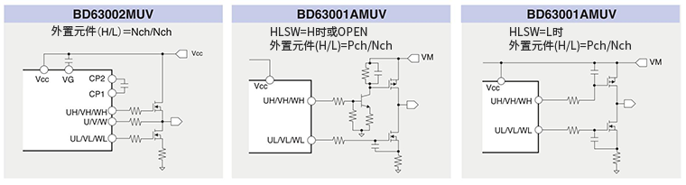 BD63001AMUV和BD63002MUV是預(yù)驅(qū)動(dòng)器規(guī)格的電機(jī)驅(qū)動(dòng)器IC,用于驅(qū)動(dòng)外置MOSFET。BD63001AMUV可以在VM電壓高于Vcc電壓的條件下使用,并支持更寬的驅(qū)動(dòng)電壓范圍。另外,當(dāng)在Vcc=VM的條件下使用時(shí),可以通過(guò)HLSW引腳設(shè)置驅(qū)動(dòng)外部高邊晶體管的UH/VH/WH引腳的邏輯,因此可以減少外置元器件的數(shù)量。