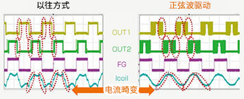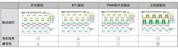 而正弦波驅(qū)動(dòng)則具有可通過(guò)外部電壓來(lái)調(diào)整PWM軟開(kāi)關(guān)區(qū)間的線圈電流的功能,因此可使線圈電流的波形變得平緩以接近正弦波。可進(jìn)一步減少線圈電流的波形失真,從而實(shí)現(xiàn)更出色的靜音性。