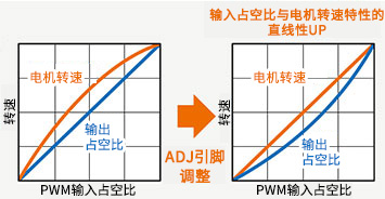 風(fēng)阻損耗是旋轉(zhuǎn)部分與空氣等之間的摩擦阻力造成的損耗。例如,在風(fēng)扇電機(jī)中,由于電機(jī)的特性,即使與輸入占空比相對(duì)的輸出占空比為直線,中間占空比附近的轉(zhuǎn)速也可能會(huì)升高。通過(guò)ADJ引腳對(duì)輸出占空比的直線性進(jìn)行調(diào)整,可提高電機(jī)轉(zhuǎn)速的直線性,并可提高速度設(shè)置精度。