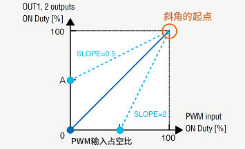 搭載了可通過(guò)SLOP引腳對(duì)PWM輸入占空比和輸出占空比的斜率特性進(jìn)行設(shè)置的功能。這是對(duì)輸入和電機(jī)轉(zhuǎn)速的特性進(jìn)行調(diào)整時(shí)使用的非常方便的功能?稍0.5~2之間對(duì)輸出占空比的斜率進(jìn)行調(diào)整。下圖為PWM輸入的示例。