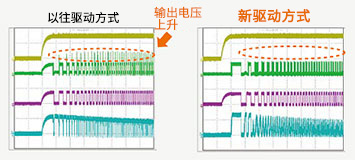 可抑制正向空轉(zhuǎn)上電時(shí)、反向空轉(zhuǎn)上電時(shí)、堵轉(zhuǎn)檢出/恢復(fù)時(shí)、扭矩輸入急劇變化時(shí)等情況下發(fā)生轉(zhuǎn)速變動(dòng)時(shí)的輸出電壓跳變現(xiàn)象。