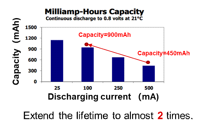 電池容量與放電電流成反比,電池使用壽命與容量具有線性關(guān)系,如圖 6 所示。將放電電流從 500mA 降至 100mA 可將電池使用壽命增加一倍。