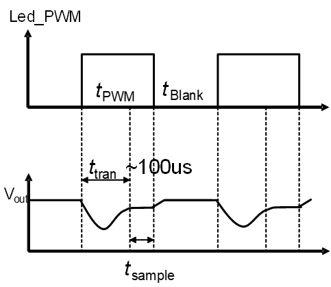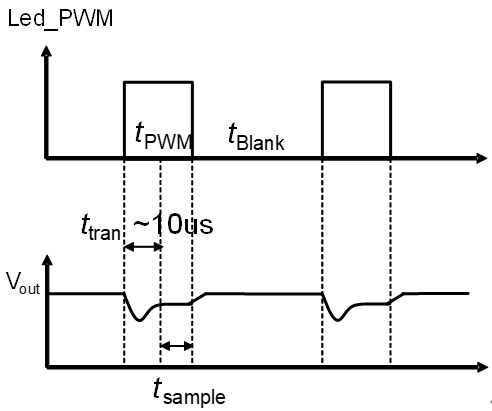 圖 7 展示了智能手表 LED 的逐周期負(fù)載情況。PWM 負(fù)載包含兩個階段:瞬態(tài)時間 (ttran) 和采樣時間 (tsample)。ttran 測量升壓轉(zhuǎn)換器在發(fā)生負(fù)載電流或電源電壓突變后快速穩(wěn)定至目標(biāo)輸出電壓的時間。tsample 是光電二極管穩(wěn)定后的恒定值。